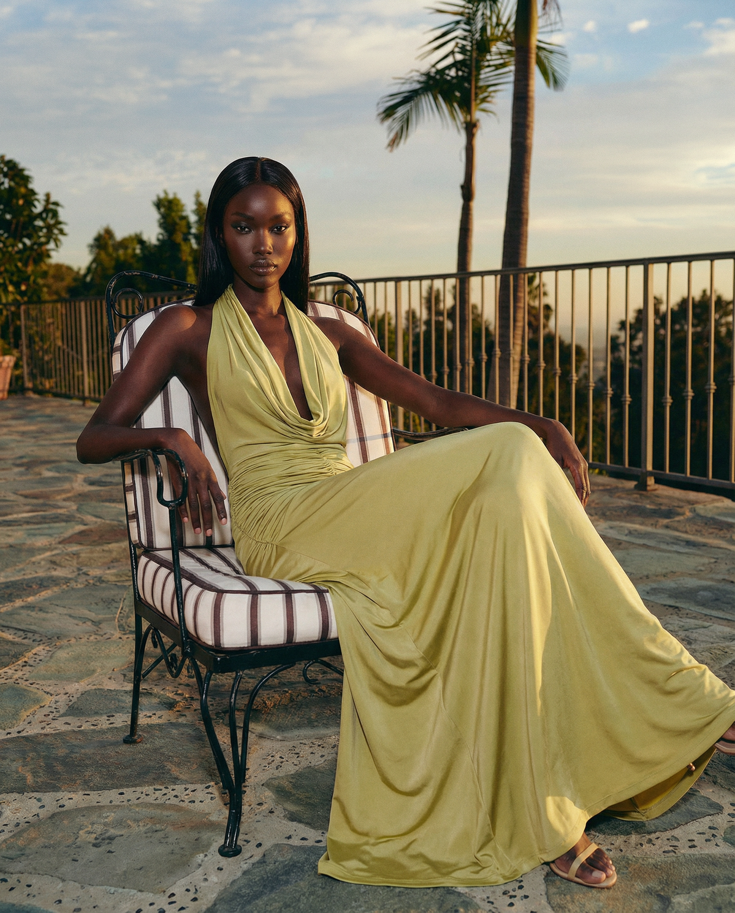 This flowing halter gown in a soft pistachio hue offers graceful draping and an open back. The dress exudes understated elegance with a touch of modern flair. Also available in espresso.