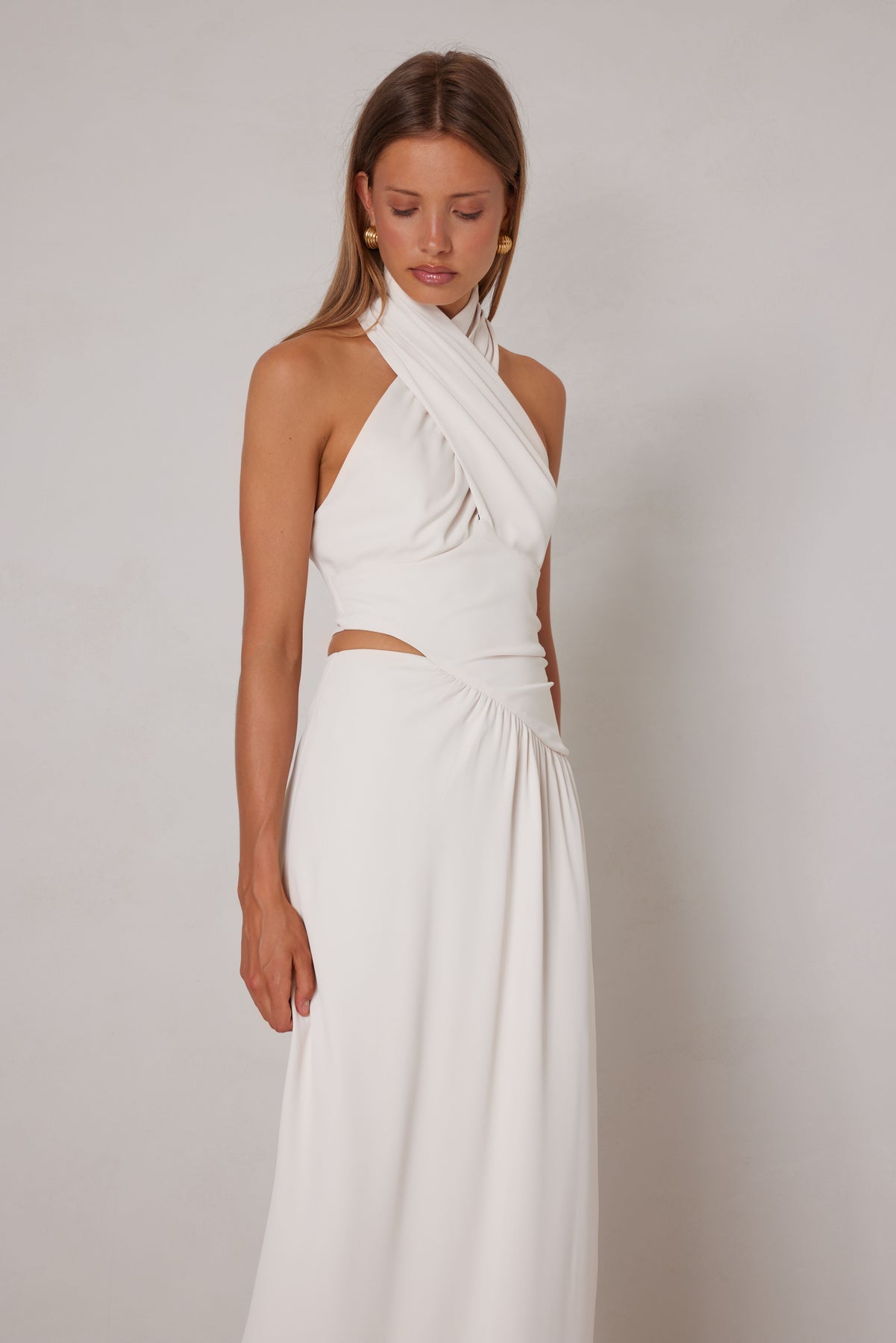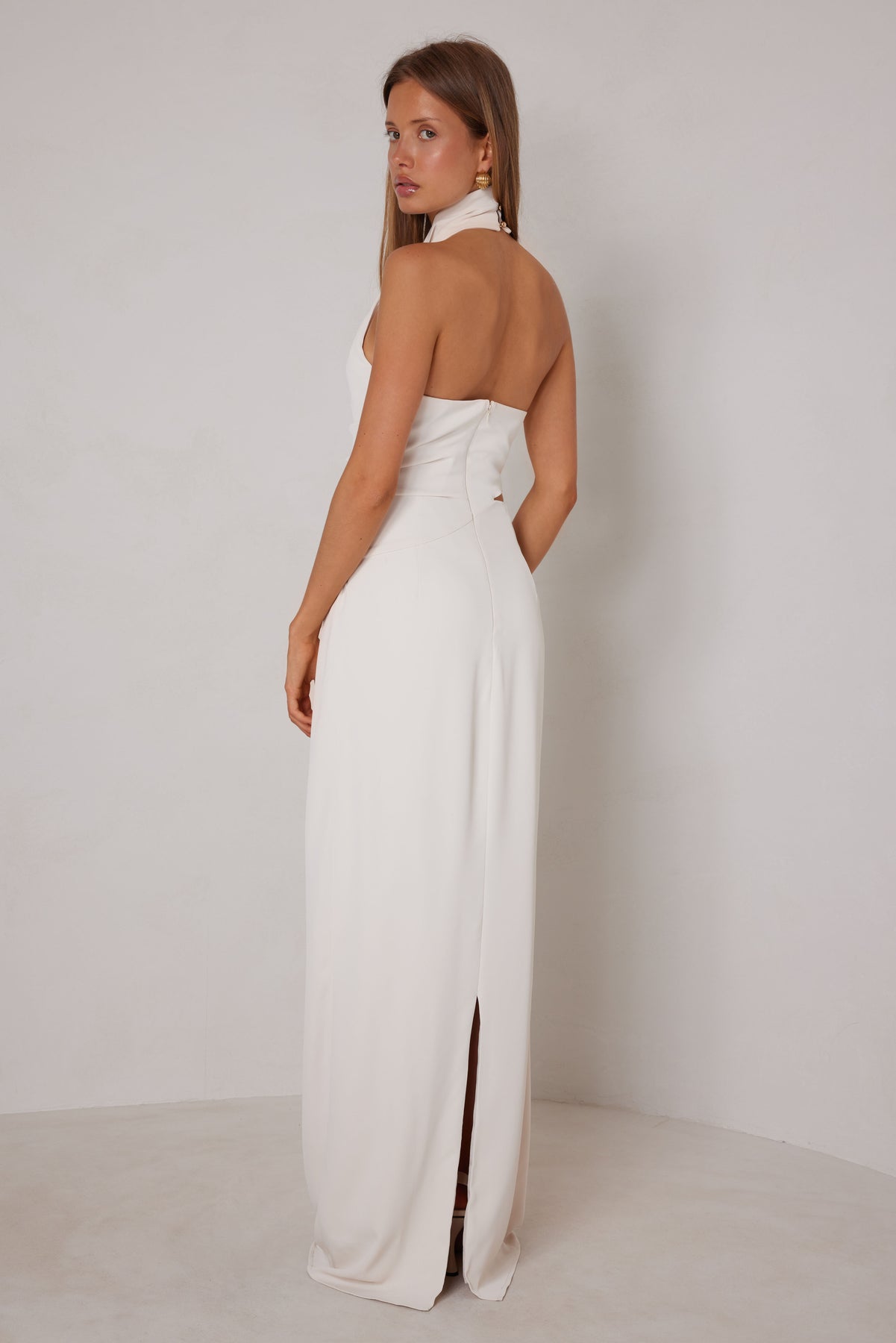 Introducing a stunning Anisha maxi featuring a subtle cutout detail and chic halter neck, beautifully framing the shoulders. The fitted bodice accentuates the waist, while the flowing skirt cascades to the floor, creating a graceful silhouette. Also available in Blue Aura
