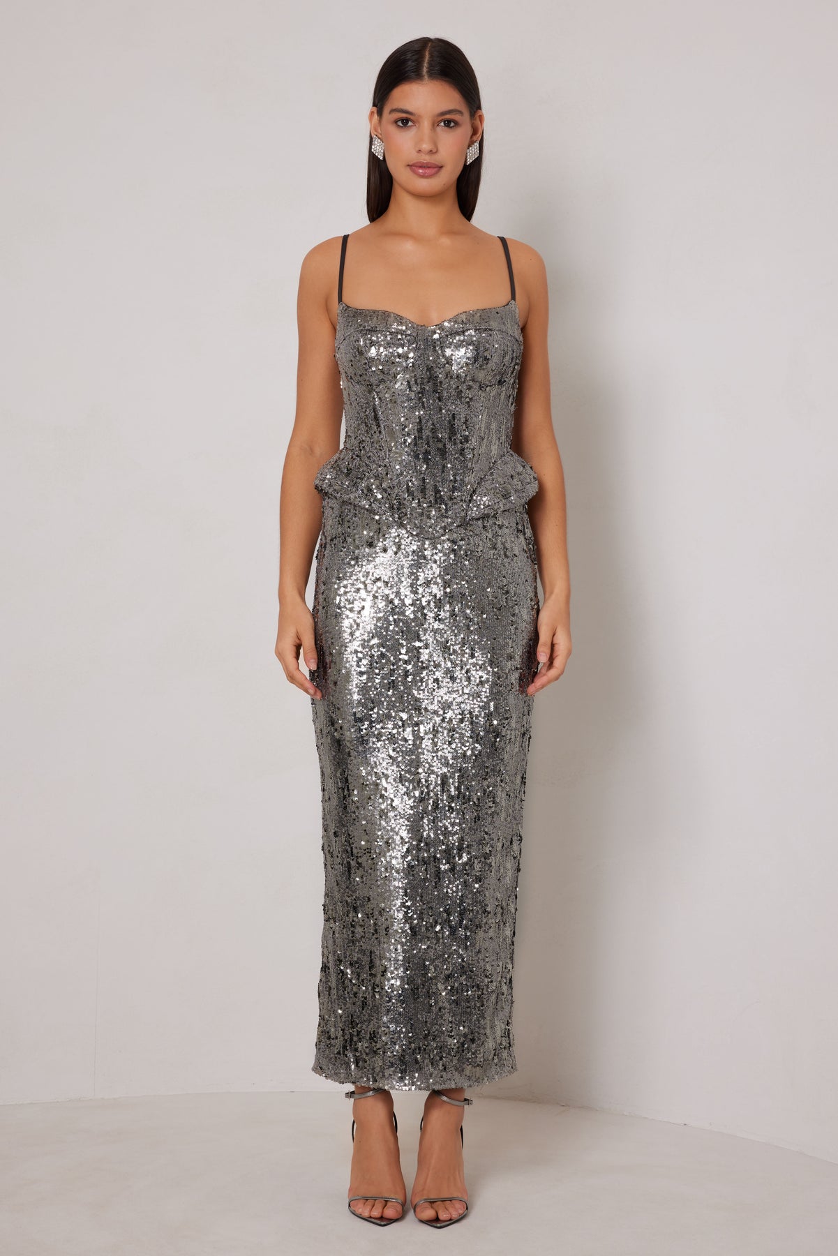This glamorous Emmet features a sparkling sequined fabric with a fitted silhouette. It's corset-style top with a peplum waist detail, enhances the waistline and adds a touch of sophistication.