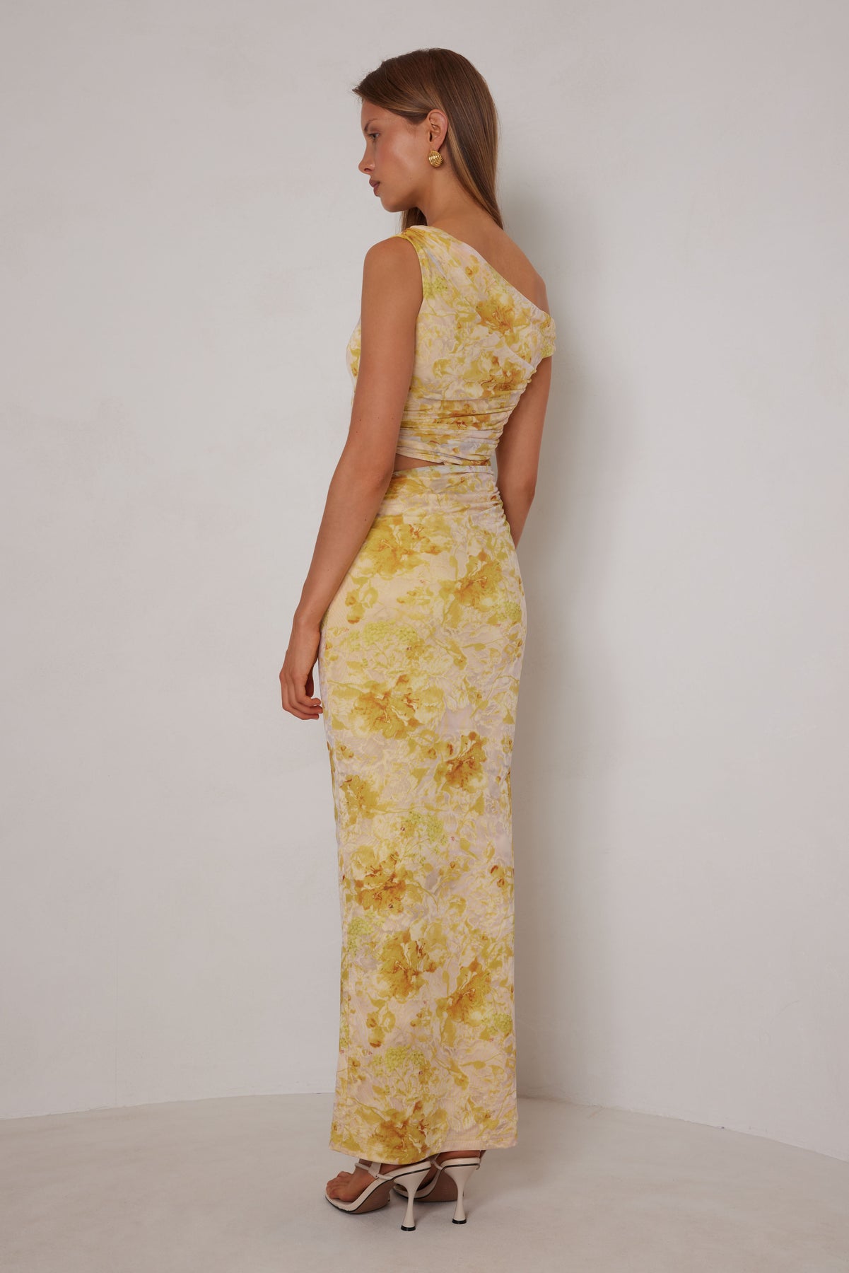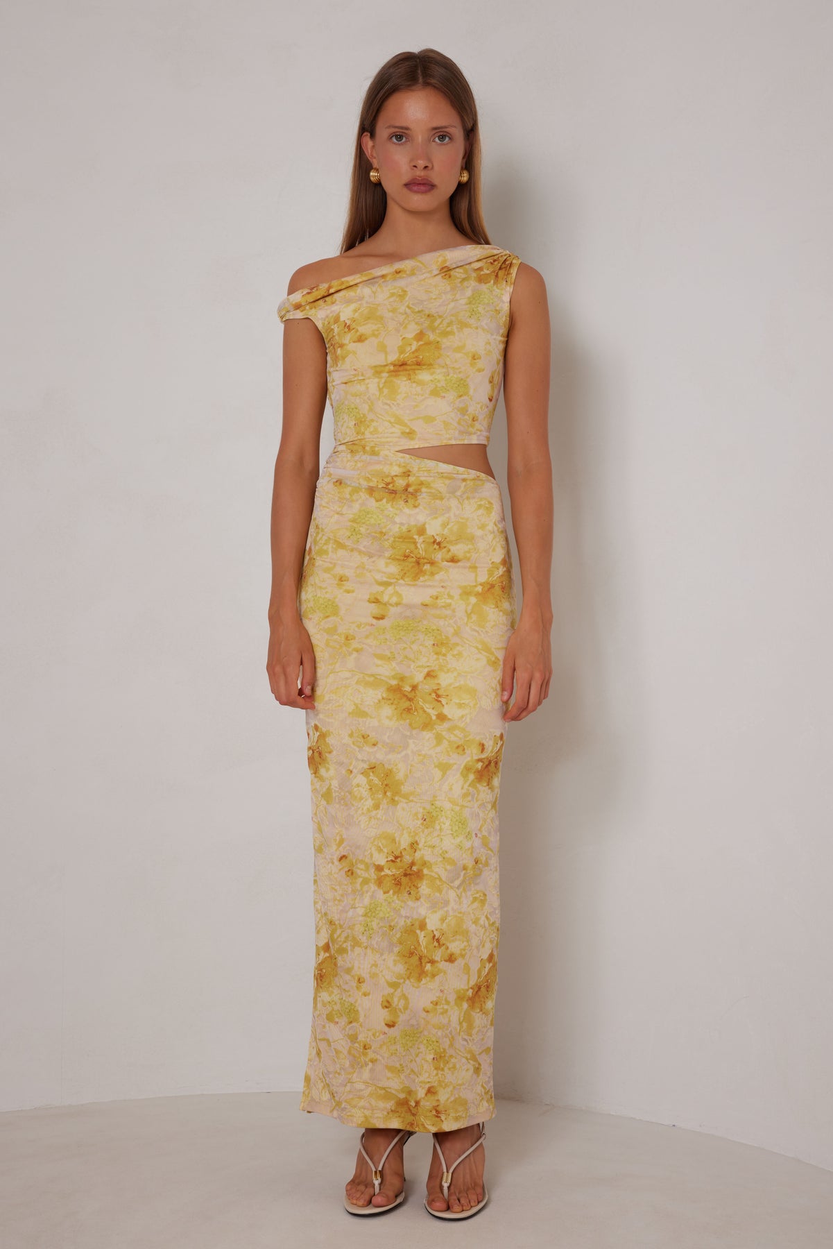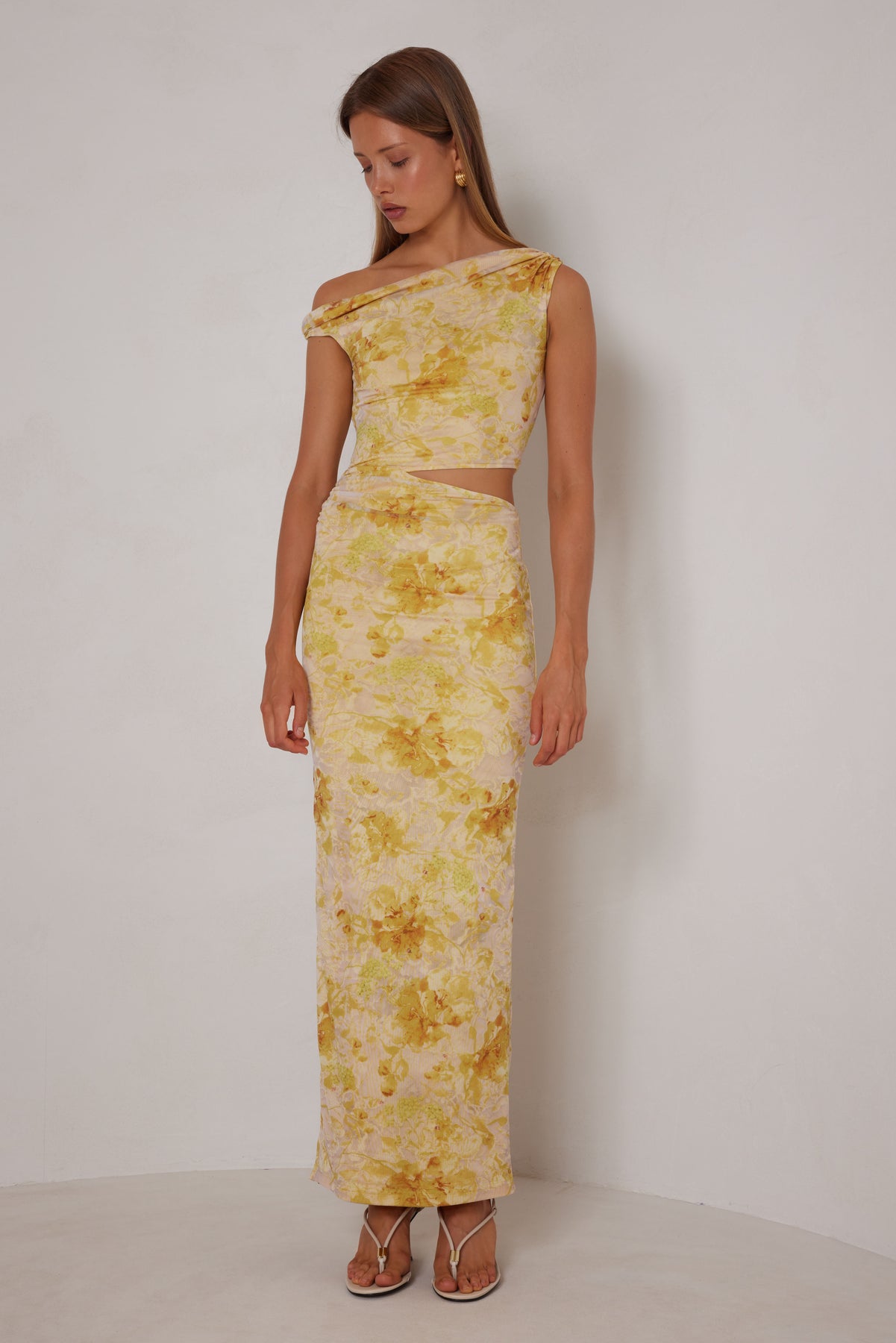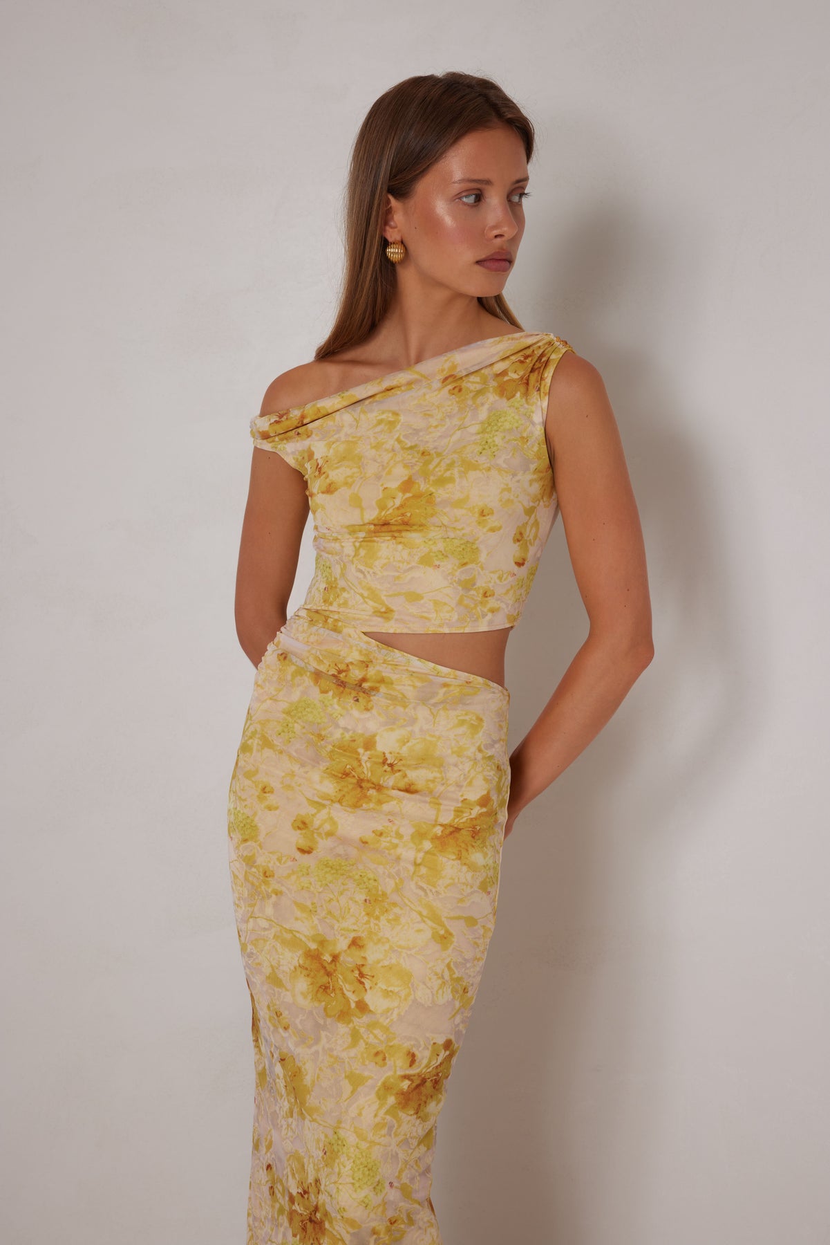 This Francesca dress features a delicate mesh fabric that beautifully hugs the body, showcasing a blend of soft yellow floral hues. Its unique one-shoulder design makes it perfect for both casual outings and more formal occasions. Pair it effortlessly with sandals for a laid-back yet stylish look, or elevate it with heels for a night out.