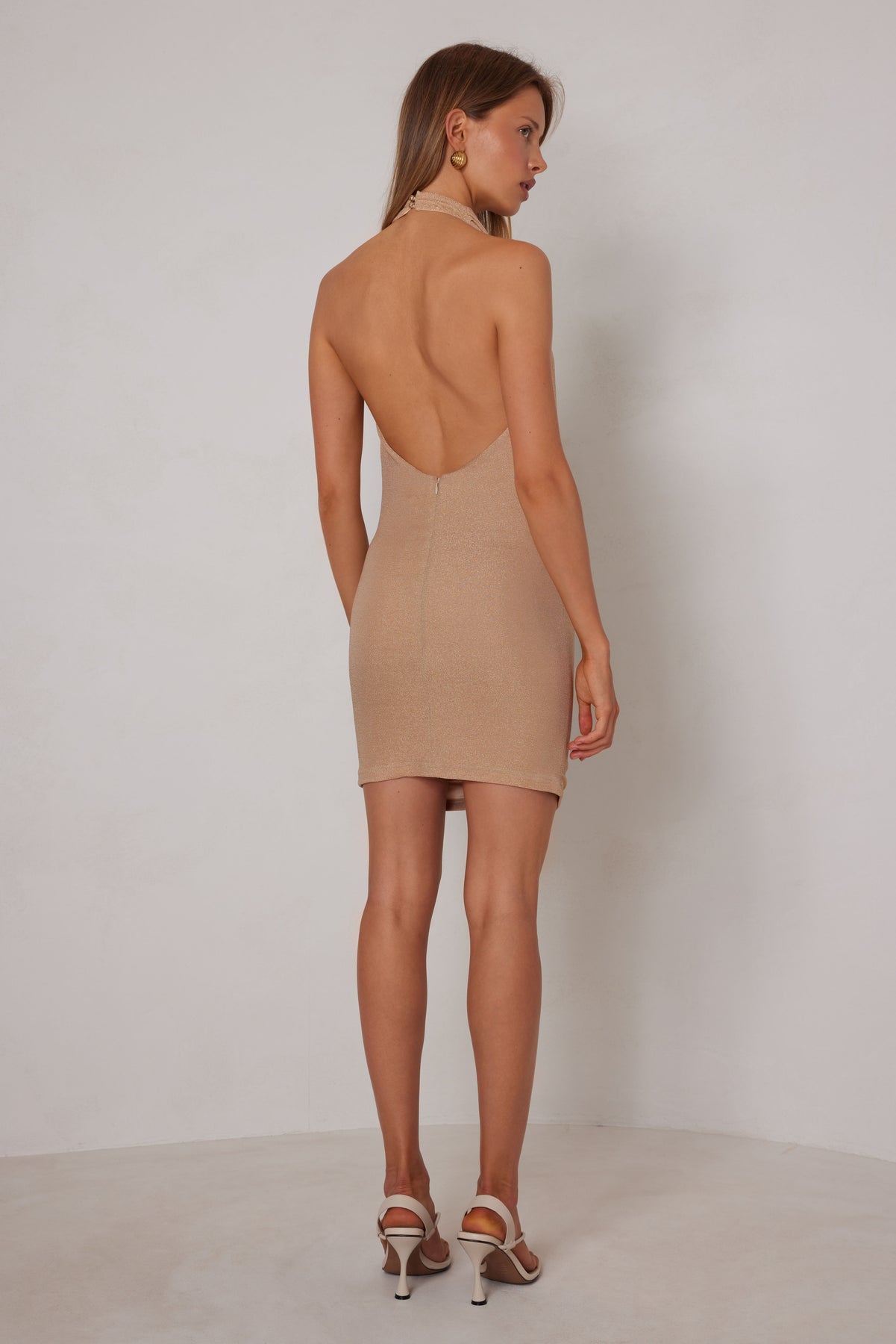 The dress features a form-fitting silhouette crafted from a stretchy, shimmering fabric has a stylish halter neck design, with a draped cowl neckline. The sexy low back and subtle skirt ruching makes it the perfect dress for a night out or a special occasion.