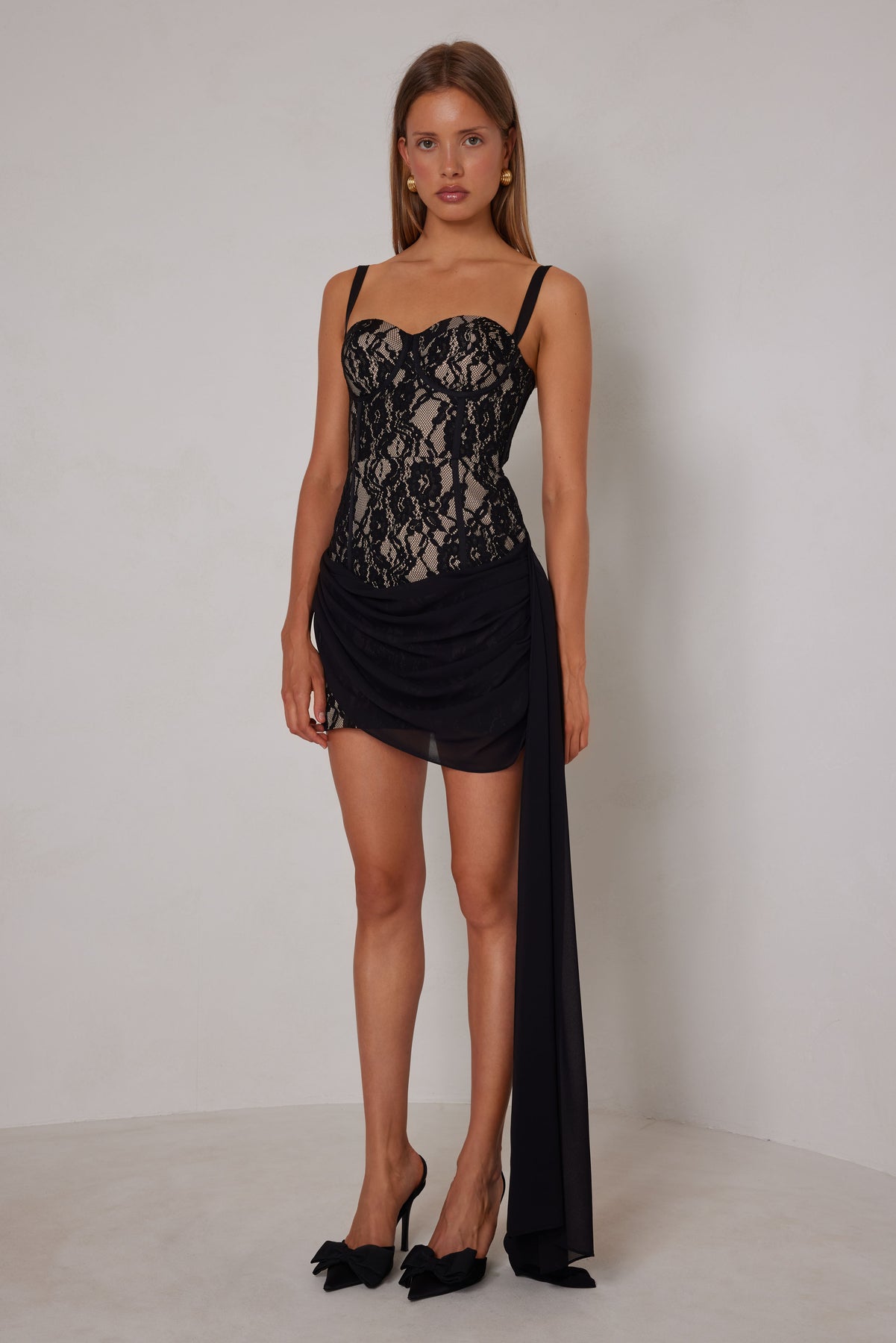 The elegant Alex dress combines lace and draped fabric details. Featuring a fitted bust with underwire cups and a sheer lace bodice effect. The skirt has a unique draped overlay that adds a sophisticated touch, complemented by a long, flowing sash on the side. Also available in White