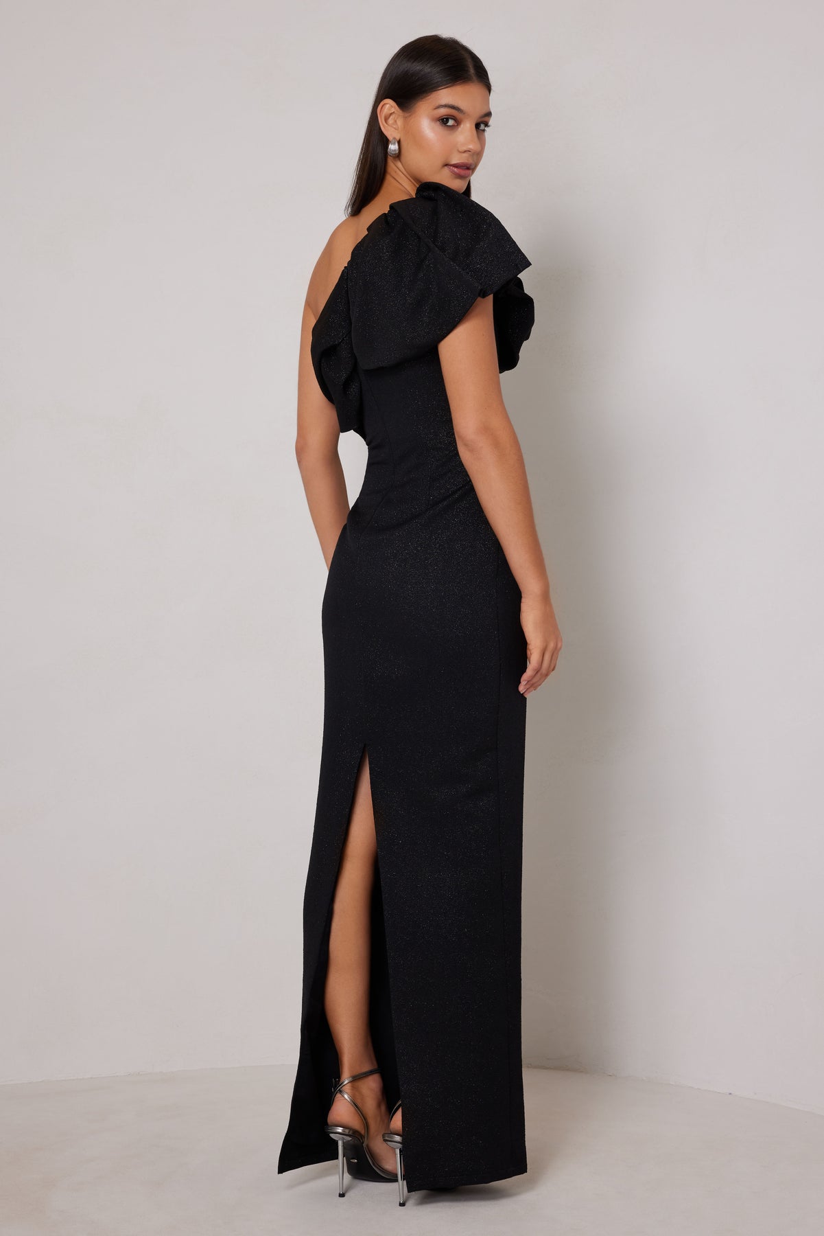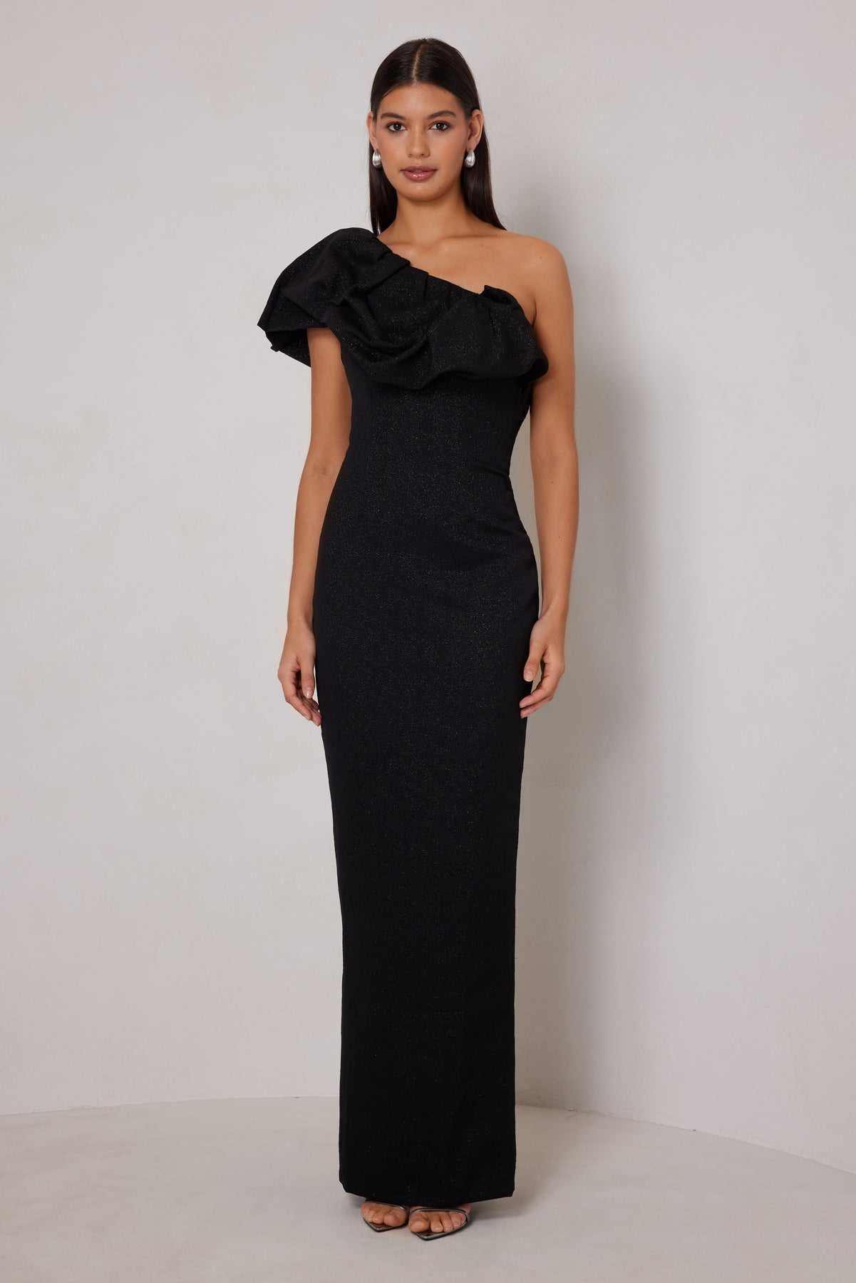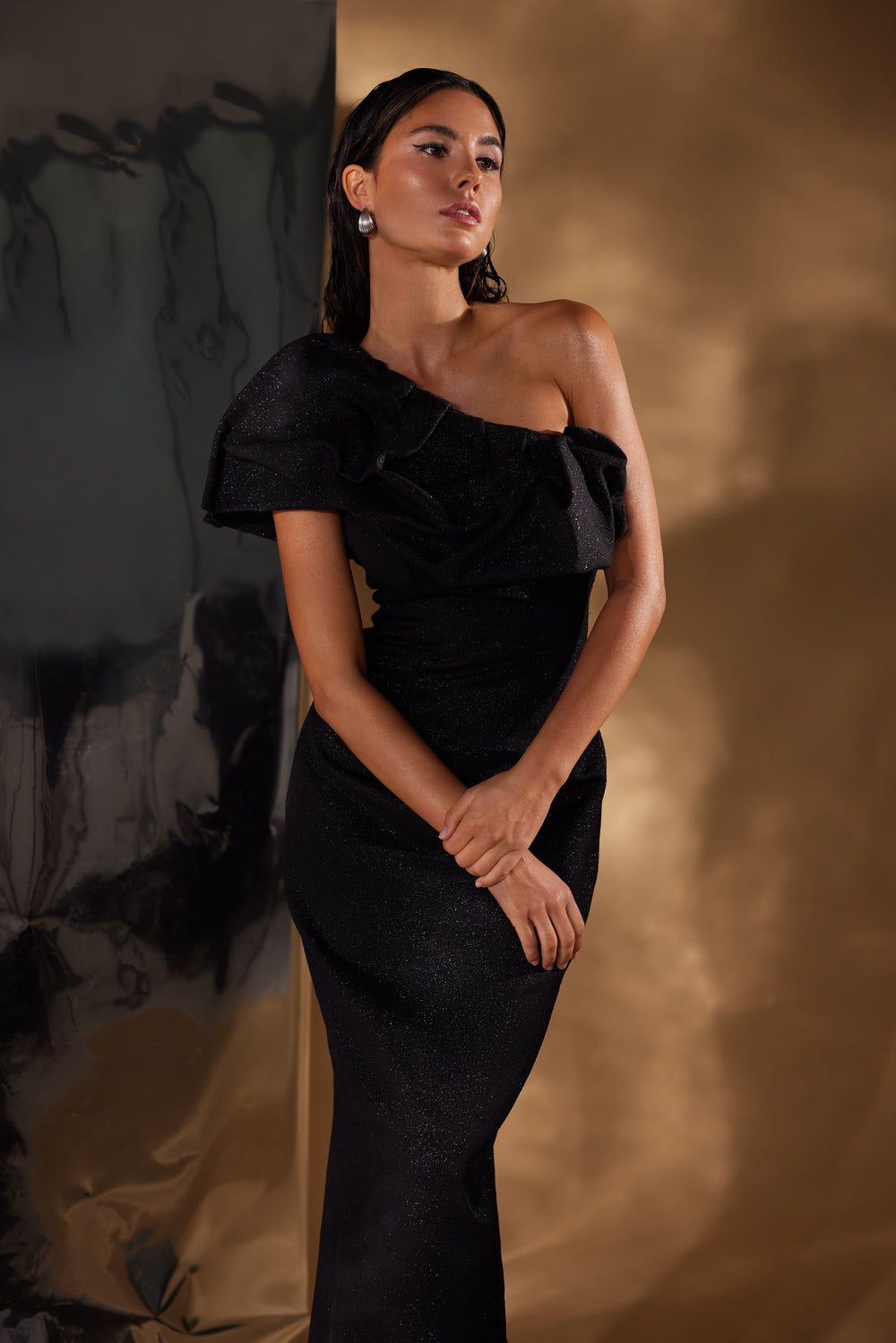 This striking one-shoulder gown makes a bold statement in classic black. Its ruffled shoulder detail and form-fitting shape ensure a memorable entrance. Also available in Rose Gold.