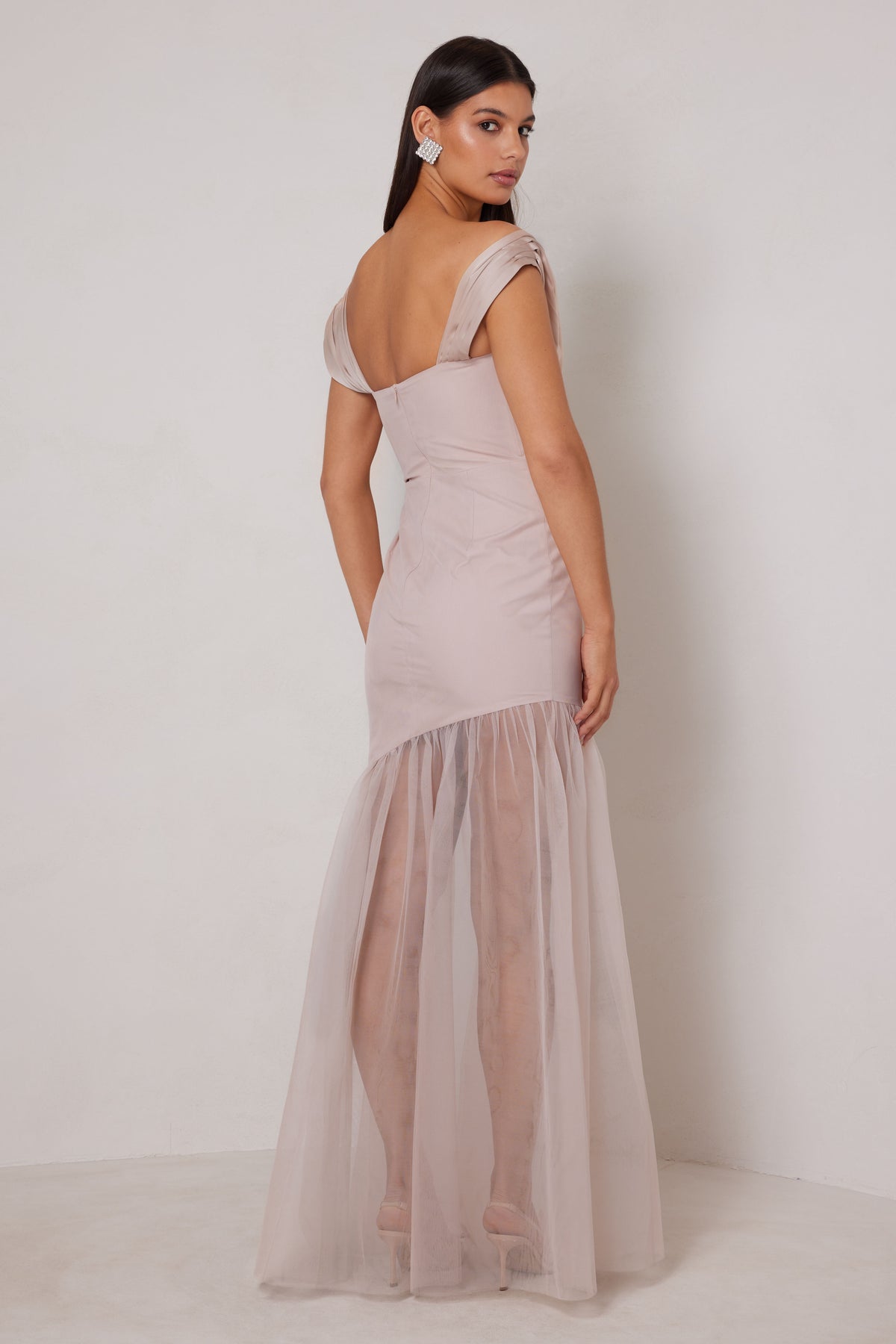 A sophisticated black gown featuring a unique draped neckline and a sheer tulle skirt. This elegant piece offers a modern twist on a classic silhouette, perfect for a formal event.