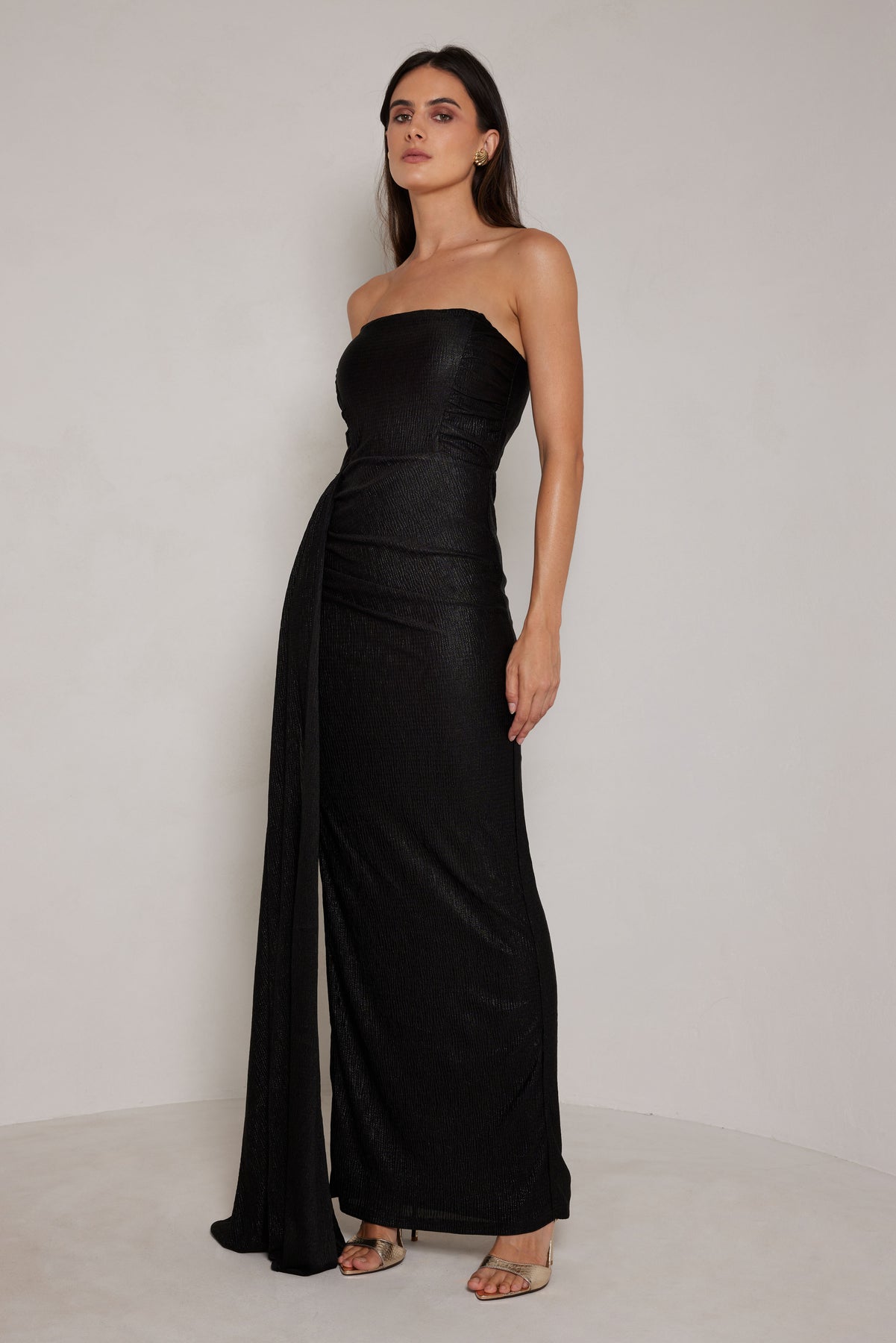 Introducing the Gabriella Strapless Gown: a luxurious full-length dress with a shimmering metallic fabric, classic strapless neckline, flattering tailored bodice, subtle draping, and a modern side sash detail.