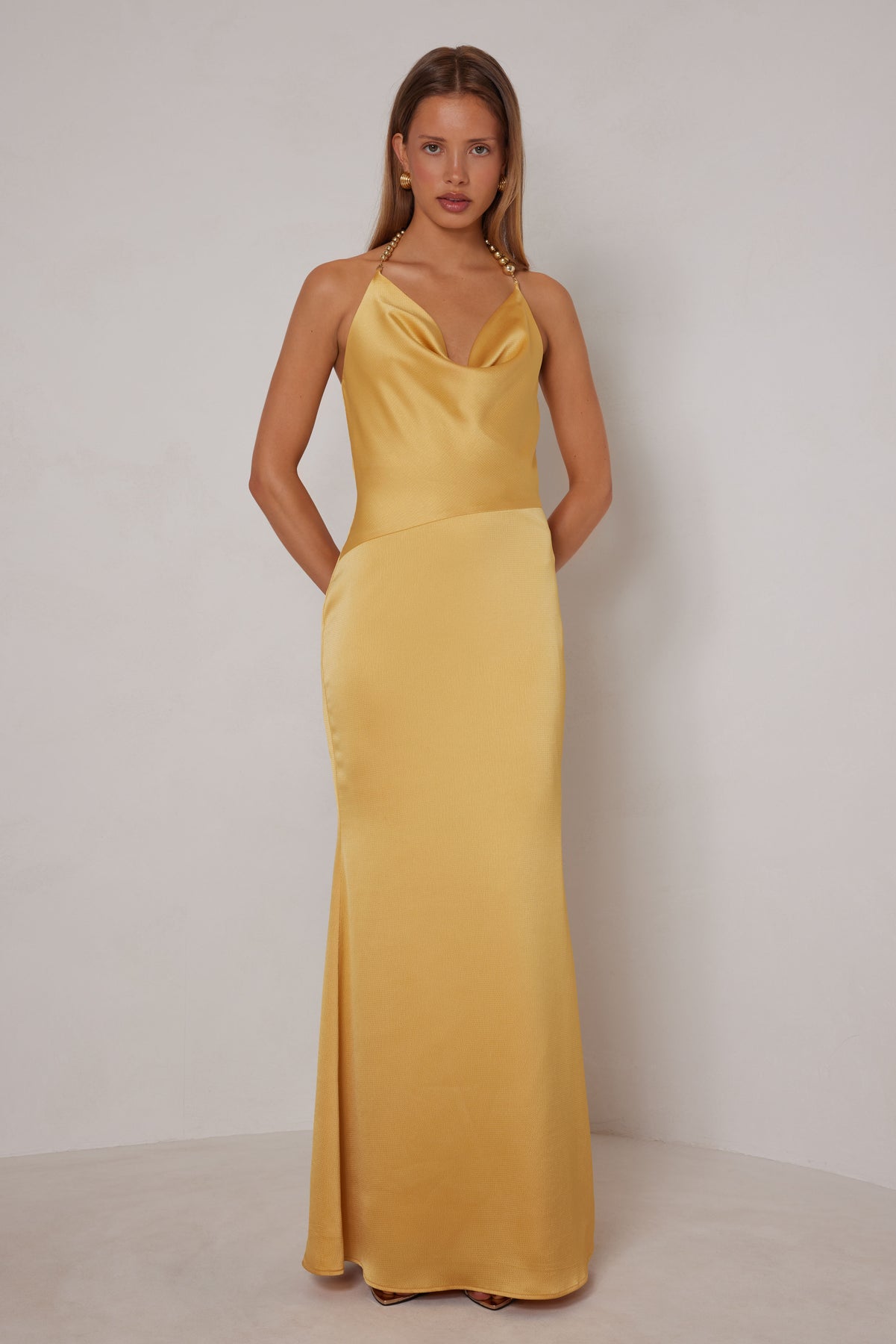 The Izabella dress features sleek halter neck design adorned with round silver hardware. This dress elegantly drapes into a cowl neckline that enhances the refined look. This sophisticated piece is perfect for any formal event.
