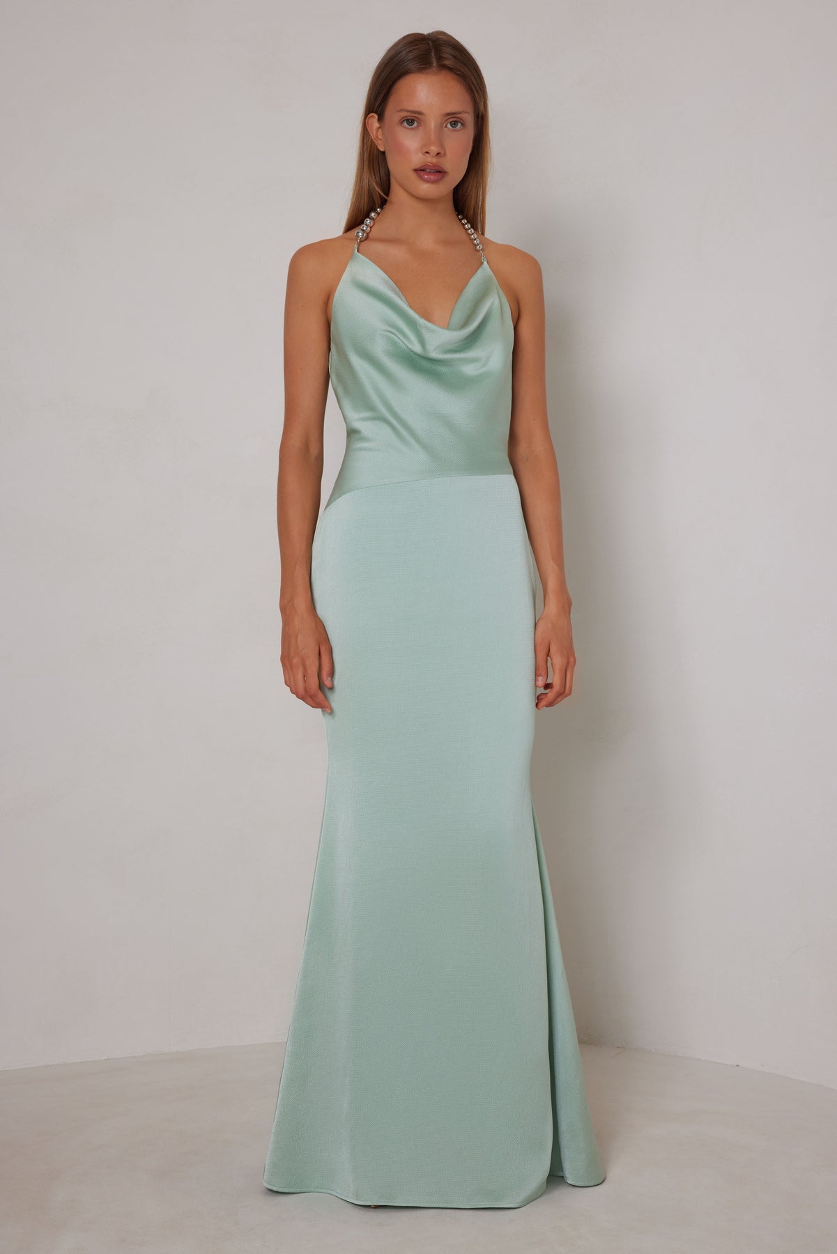 Featuring a soft, mint green hue this dress has a halter neck design that gracefully frames the shoulders, leading into a flowing silhouette that hugs the body gently. The front is gathered at the waist, creating a flattering drape that enhances the figure while the back has a sexy low back.