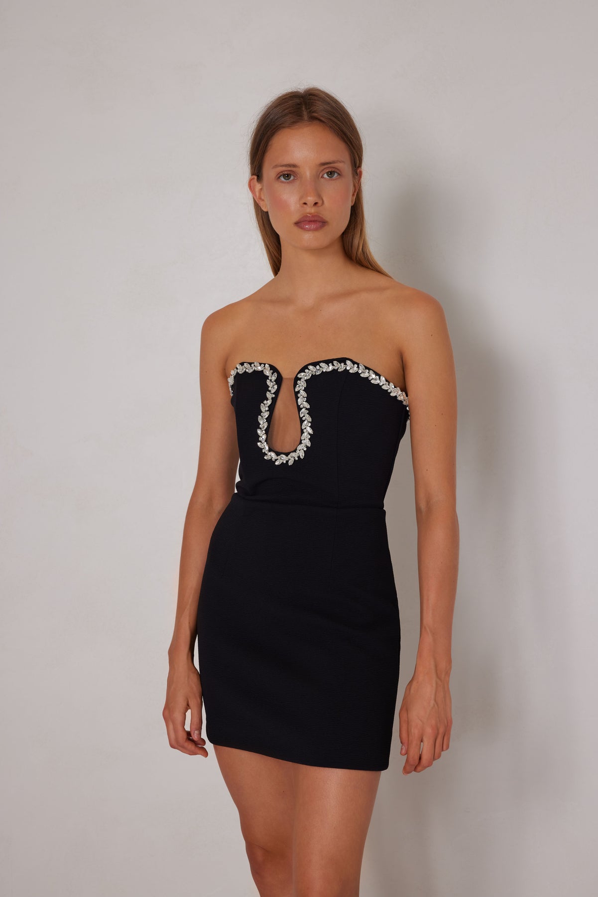 The dress is a fitted, strapless design that features a striking neckline with a unique cutout, accentuated by a decorative stone trim that adds a touch of elegance. Made from a thick and stretchy fabric, it hugs the body closely, creating a sleek silhouette.