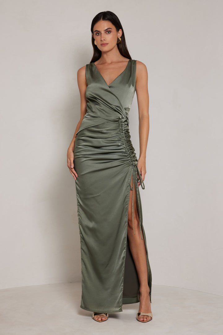 This stunning dress features a flattering V-neckline and a ruched design on one side, accentuating your curves in all the right places. The side tie-up allows you to adjust the fit to your liking. Crafted from luxurious satin fabric, this dress drapes beautifully and has a subtle sheen.