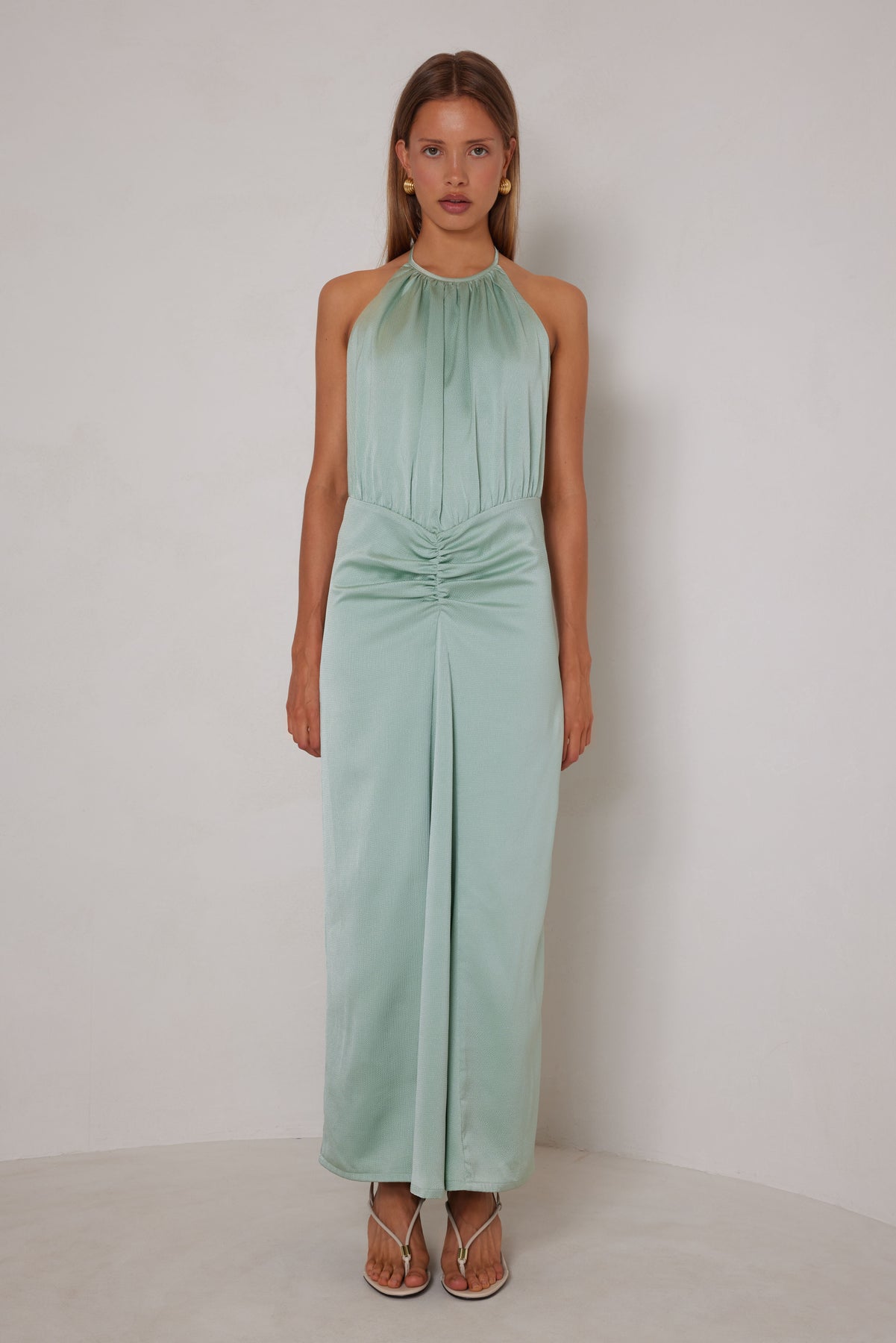 Featuring a soft, mint green hue this dress has a halter neck design that gracefully frames the shoulders, leading into a flowing silhouette that hugs the body gently. The front is gathered at the waist, creating a flattering drape that enhances the figure while the back has a sexy low back.