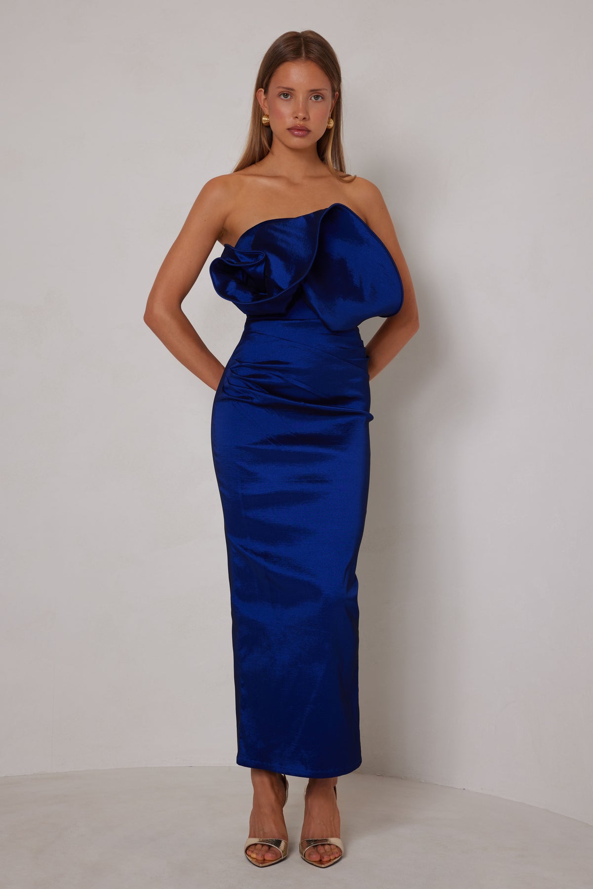 The Miles dress is an elegant, floor-length gown features a showstopping 3D effect, creating an oversized sculptural feature which is meticulously created using wire, adding sophistication and drama. The dress also features a fitted silhouette complimented by gathering along the body for a flattering look.