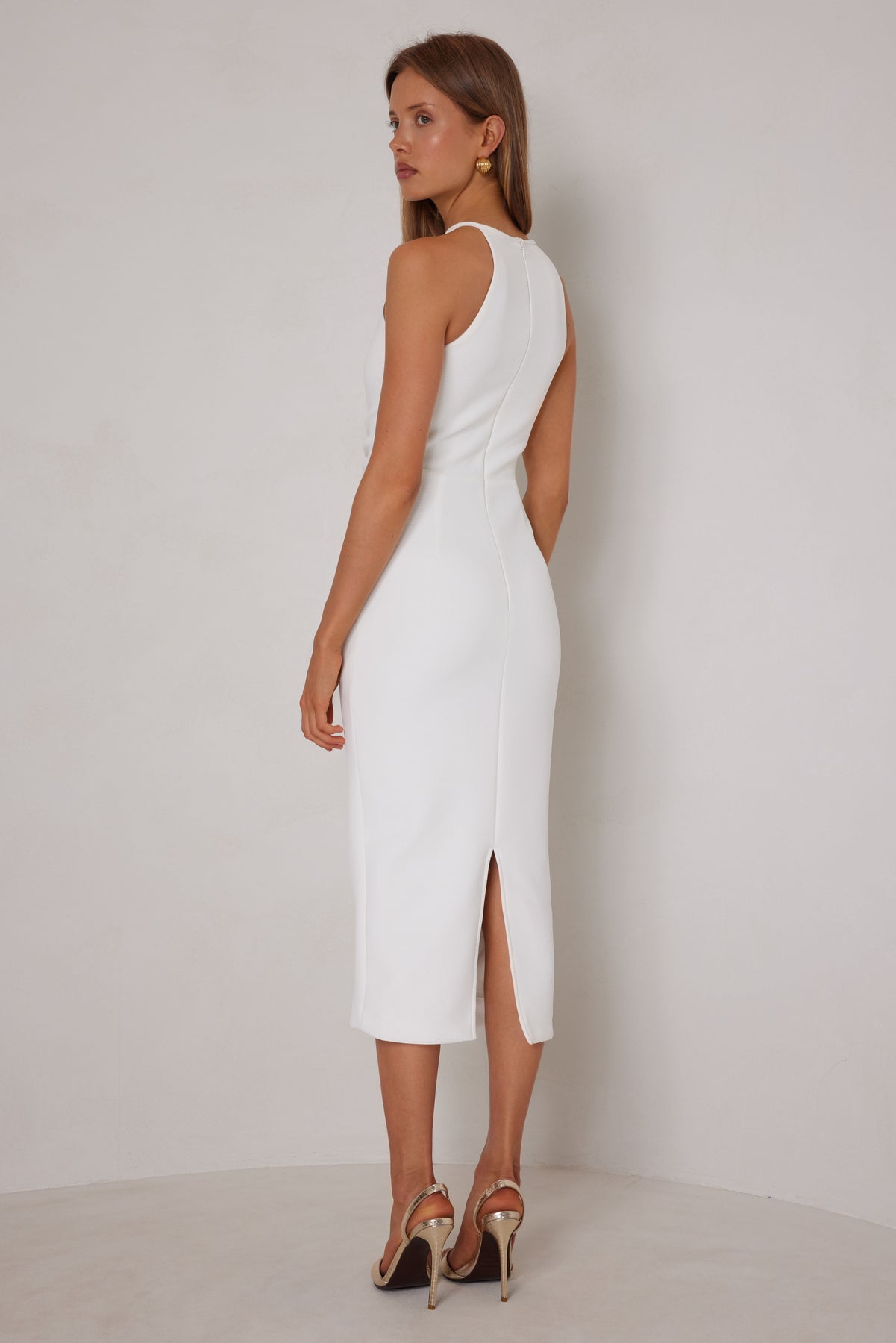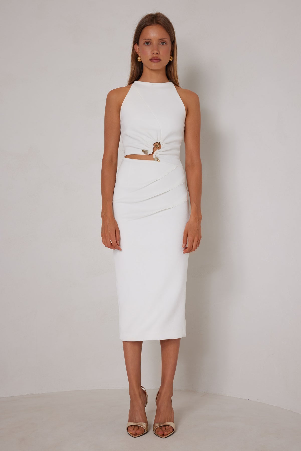 This stunning dress features a sleek design that elegantly frames the shoulders and collarbone. The dress features a unique cut-out detail at the waist, adorned with a beige and gold hardware. Crafted using a thick fabrication, enhancing the overall shape. Perfect for a night out or a special occasion. Also available in Black